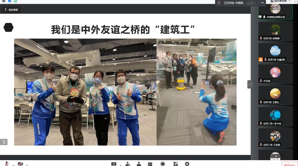 朱寯晗同学从三个方面为2021级投资量化三班团支部讲述自己的冬奥经历,介绍了自己所在岗位的具体工作,分享了与外国记者交流的趣事,最后表达了自己作为志愿者感受到的集体归属感与荣誉感。