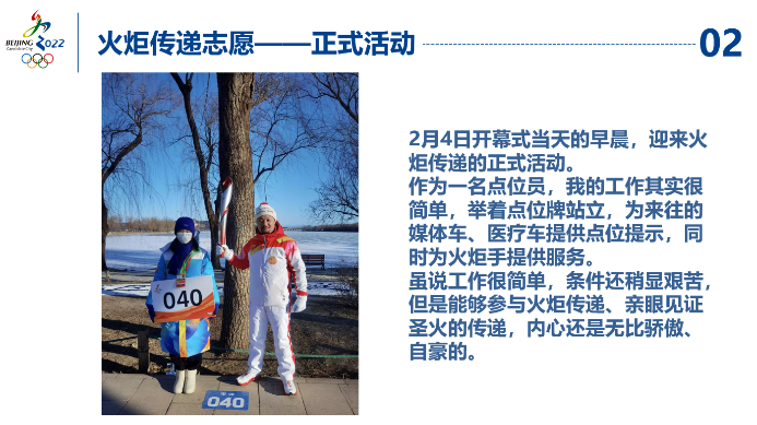 林芷萱同学为2021级本科金融二班团支部介绍了自己作为火炬传递点位员以及首体外的城市志愿者的相关工作。提到自己对志愿者的理解,林芷萱认为“城市志愿者的身份更像是冬奥与城市的衔接,虽然都是琐碎细小的工作,但是用热情去感染市民、观众,为城市的角落带去冬奥的温度,这也不失为一种意义”。