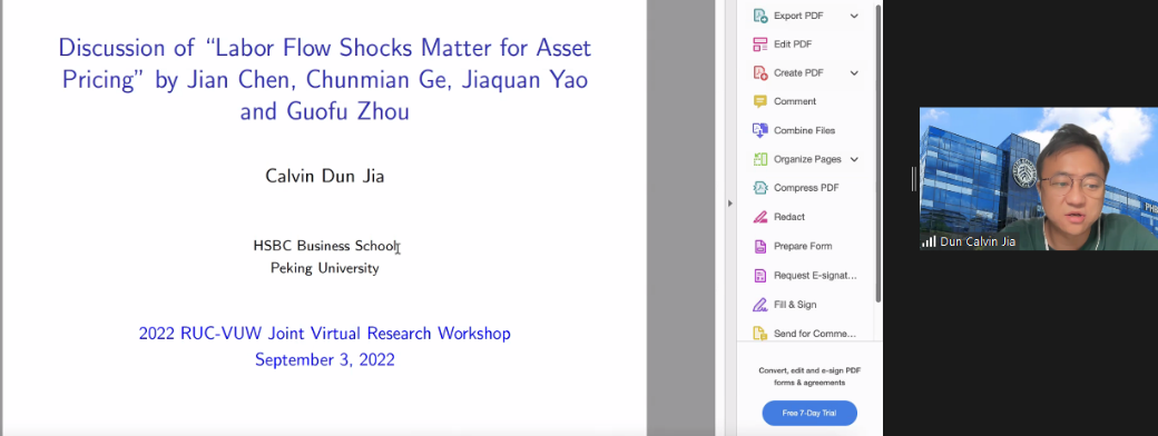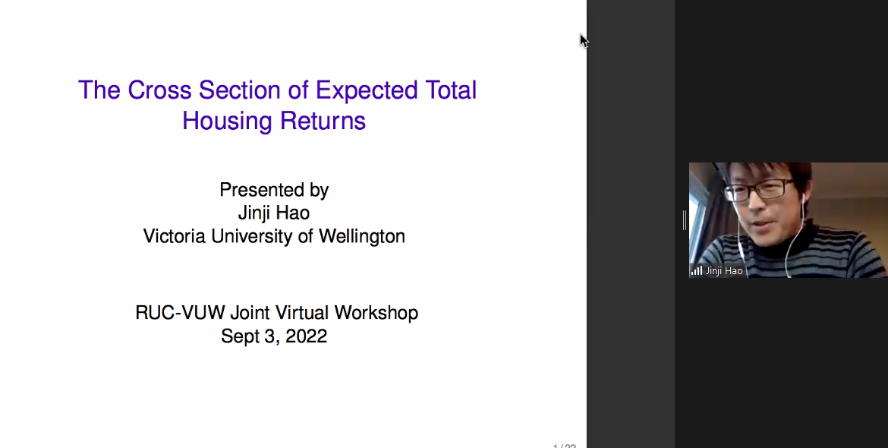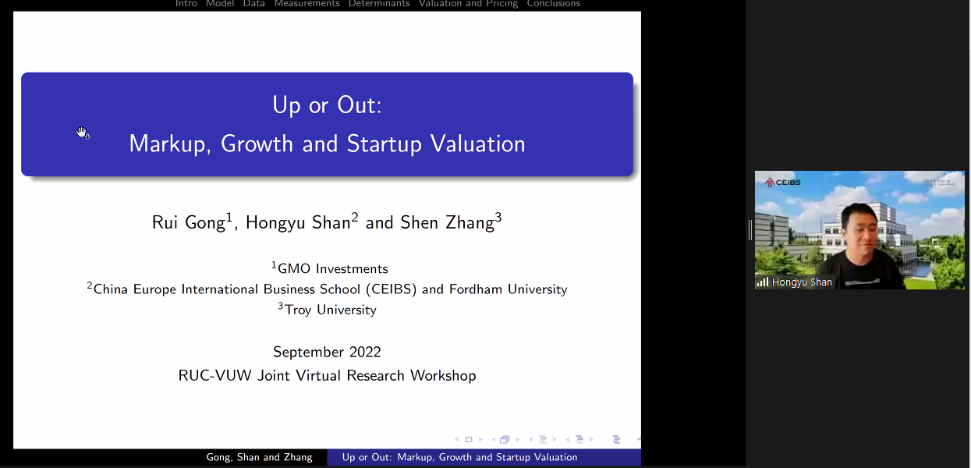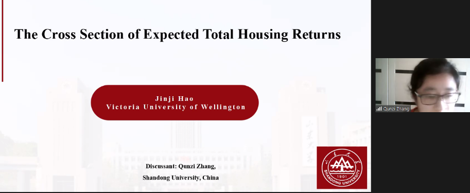 下午会议的第一部分。来自惠灵顿维多利亚大学的Jinji Hao、中欧国际工商公司的单宏宇分享了论文。Jinji Hao题为The Cross-Section of Expected Total Housing Returns的文章研究了预期住房总收益的截面决定因素,发现了显著的价值效应、动量效应和逆转效应。山东大学的张群姿点评了这篇论文。单宏宇题为Up or Out:Markup,Growth and Startup Valuation的文章研究了企业如何在盈利能力、增长和估值等战略目标中平衡,讨论了使得企业估值接近其盈利能力的条件。圣加仑大学的Vesa Pursiainen点评了这篇文章。