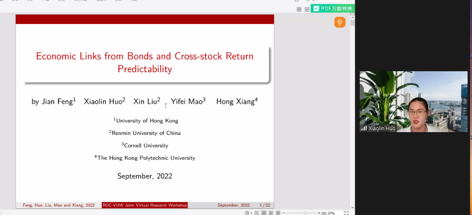 时间:2022-09-042022年9月3日上午8点半,“金融科技与风险”国际学术论坛在ZOOM线上会议室召开。来自国内外多所高校的学者展示了以金融科技与风险为主题的多篇论文,并对此展开讨论。本会议由304永利集团与惠灵顿维多利亚大学经济与金融公司联合举办,科研处国际云研讨会项目支持。公司刘昕和惠灵顿维多利亚大学Cheng Zhang主持会议。
