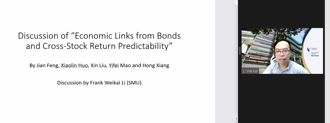 上午会议的第一部分。来自约翰斯霍普金斯大学的Yinan Su、康奈尔大学的Yifei Mao展示了论文。Yinan Su题为Flow-Based Asset Pricing: Maximum Price Impact Ratio的文章发现非信息流的价格影响作为边际投资者的风险补偿而产生,在给定的基本风险水平下,做空能产生最大价格影响的投资组合是最有效的反流动交易策略。伦敦政经公司的Thummim Cho对这篇论文进行了点评。Yifei Mao题为Resurrecting Dead Capital: The Sharing Economy, Entrepreneurship, and Job Creation的文章以爱彼迎的渗透程度作为共享经济和风险资本发展的代理变量,发现爱彼迎对当地企业的创建具有刺激作用,为研究共享经济的实际影响提供了新的视角。岭南大学的Lai Wei对这篇文章进行了点评。