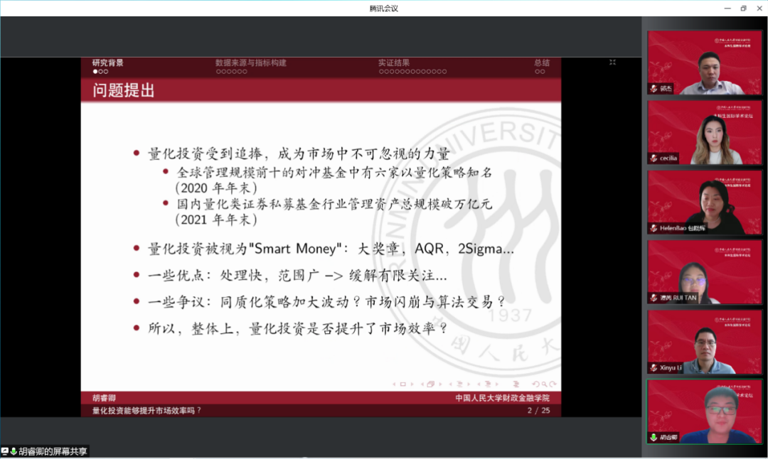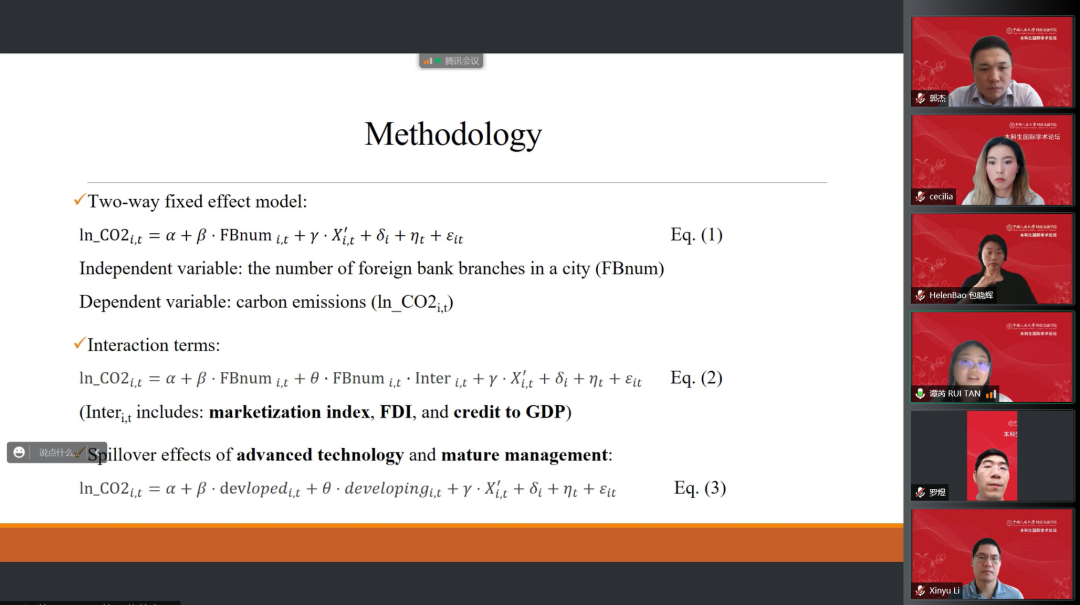 论坛由公司党委副书记、2019级金融科技双学位实验班班主任罗煜副教授和2018级金融学-数学双学位实验班班主任芦东副教授主持。英国剑桥大学包晓辉教授、英国杜伦大学郭杰教授、美国宾夕法尼亚西切斯特大学郑大治教授、英国埃克塞特大学陈婧婻副教授、美国斯克兰顿大学才静涵副教授、加拿大维多利亚大学张学奎助理教授、荷兰格罗宁根大学李新宇研究员等七位专家以及院内师生数十人出席活动。