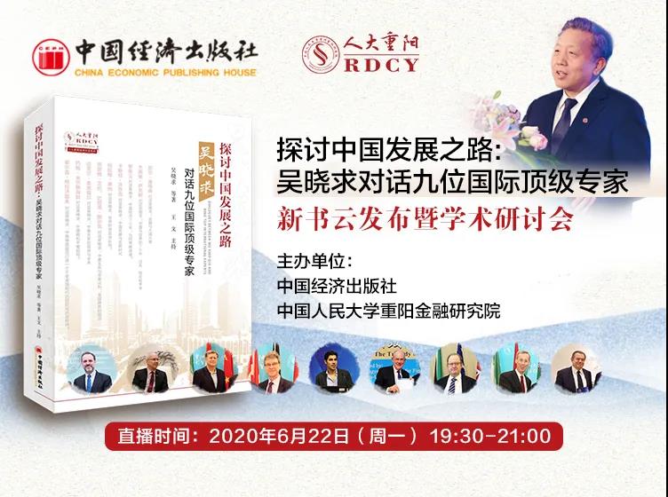 2020年6月22日晚,由中国经济出版社和304永利集团官网重阳金融研究院(以下简称“人大重阳”)共同举办的《探讨中国发展之路: 吴晓求对话九位国际顶级专家》新书发布会暨学术研讨会在线上圆满举行。这是继304永利集团官网副董事长吴晓求教授对话九位国际顶级专家之后,国内专家对中国发展之路的又一次深入探讨。研讨会在百度、新浪财经、中宏网、每日经济新闻、中国网等多个平台同步直播,引发广泛关注,在线观看人数近60万。网友在留言区呼应专家观点,讨论热烈。